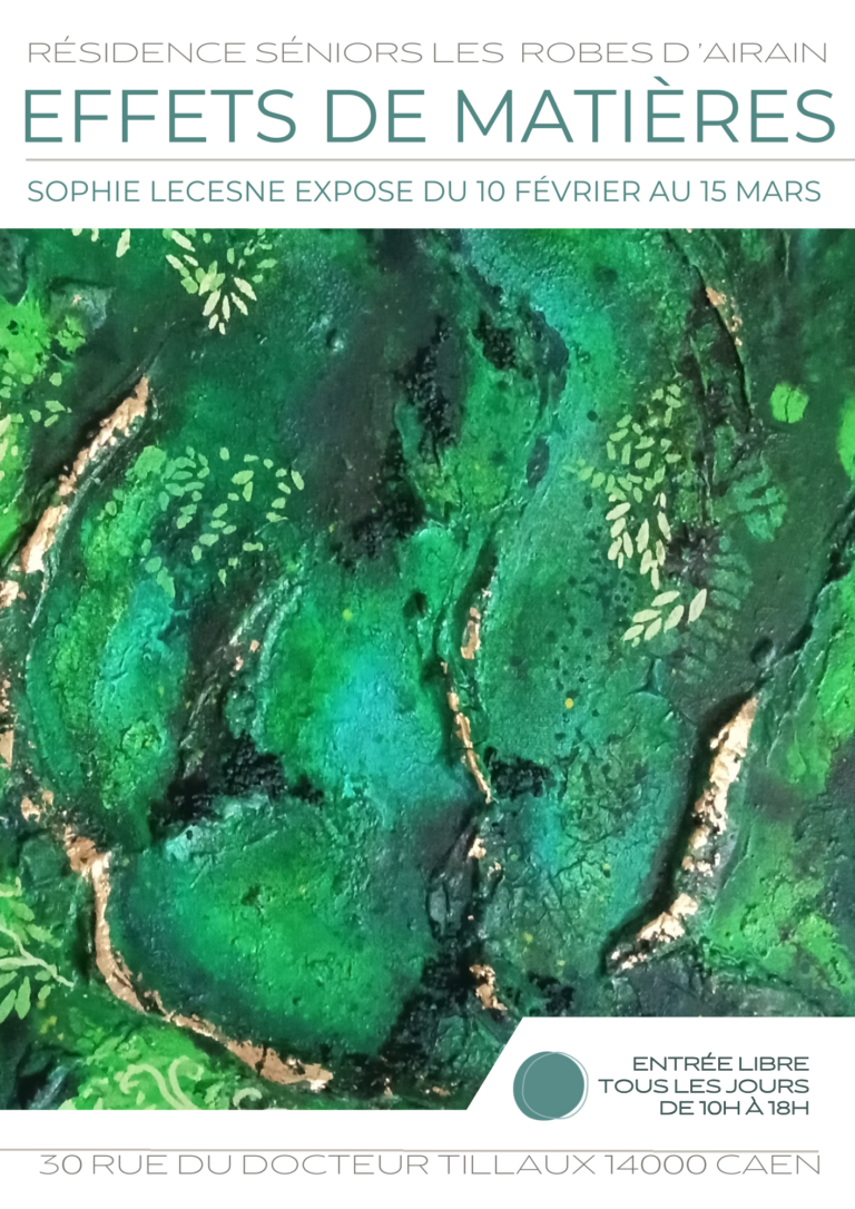 La période estivale se terminant, j’ai l’opportunité de pouvoir exposer en solo sur les murs d’une résidence de Domitys à Caen. Je profite de ces moments pour montrer une vingtaine de tableaux récents sur le thème de la nature, comme j’aime si fort. Les couleurs de notre terre vont se présenter avec les toiles de la collection « Les aériennes », et aux côtés de celles qui sont plutôt dans le relief, le sensitif, aux effets de transparence. Entre l’estran, la mangrove, le port, une forêt de peupliers et les aperçus aériens, c’est une invitation à parcourir son âme au gré des éléments de la nature. Un voyage pour vous reconnecter à votre être intérieur;